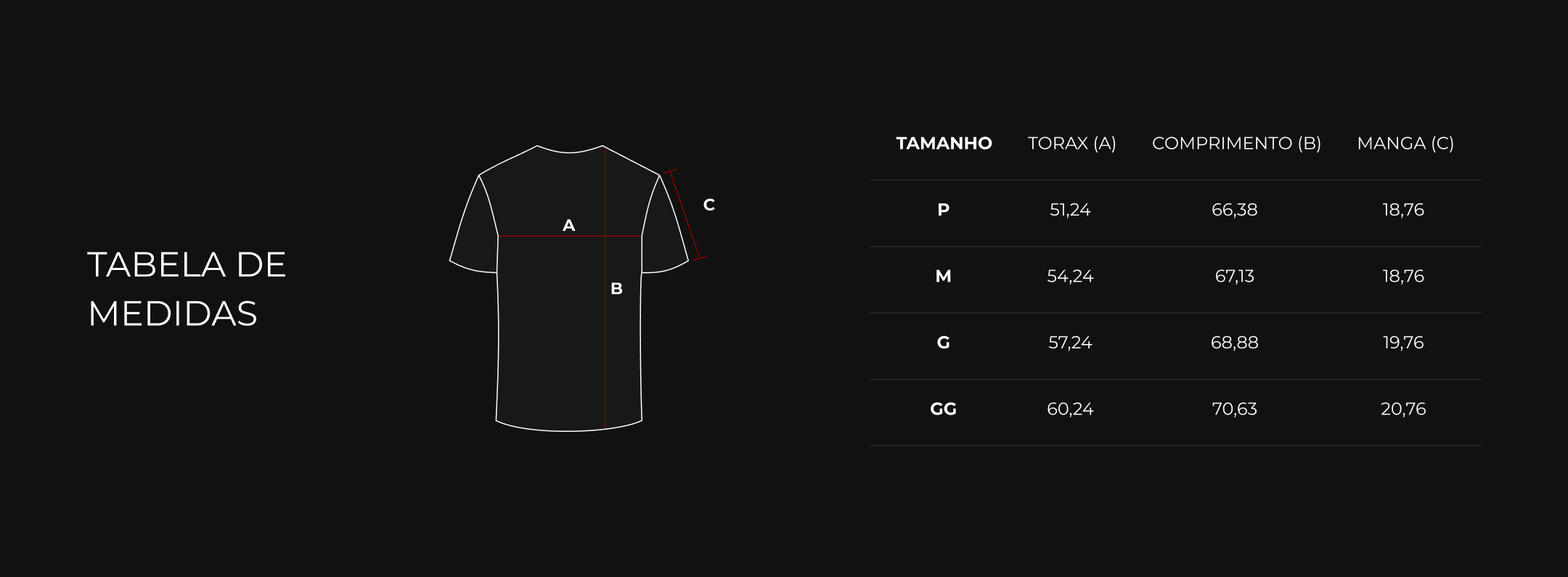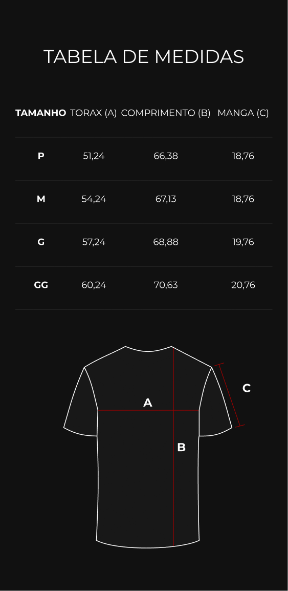 Se tiver dúvidas sobre tamanhos, consulte a tabela de medidas logo abaixo.